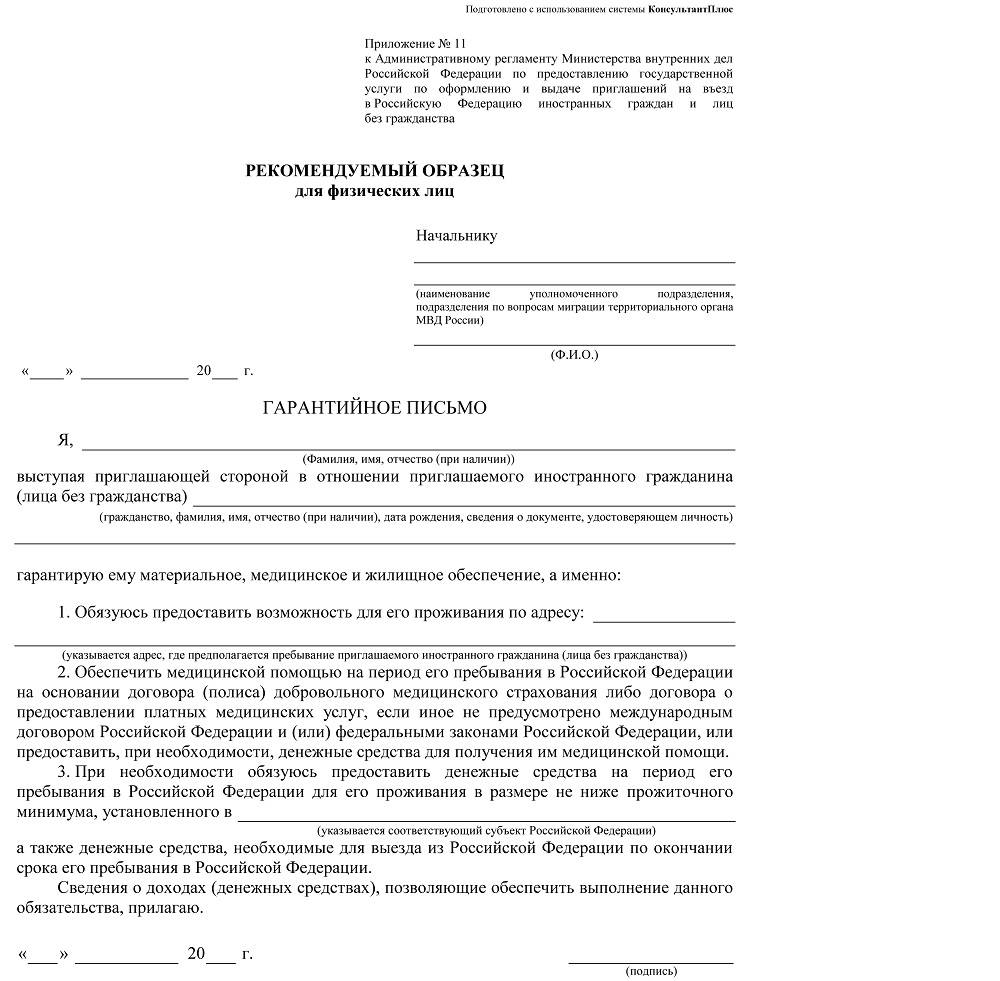 При подготовке образца гарантийного письма физическому лицу, выступающему приглашающей стороной, потребуется указать в заявлении следующие сведения: