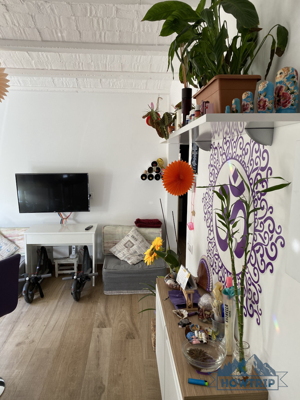 Ценителей стильного дизайна порадуют пастельные тона стен и штор, необычные постеры и похожая на одуванчик яркая люстра. В апартаментах есть все необходимое для удобной жизни — полноценная кухня, обеденный уголок, ванна и балкон с видом на тихую улицу.