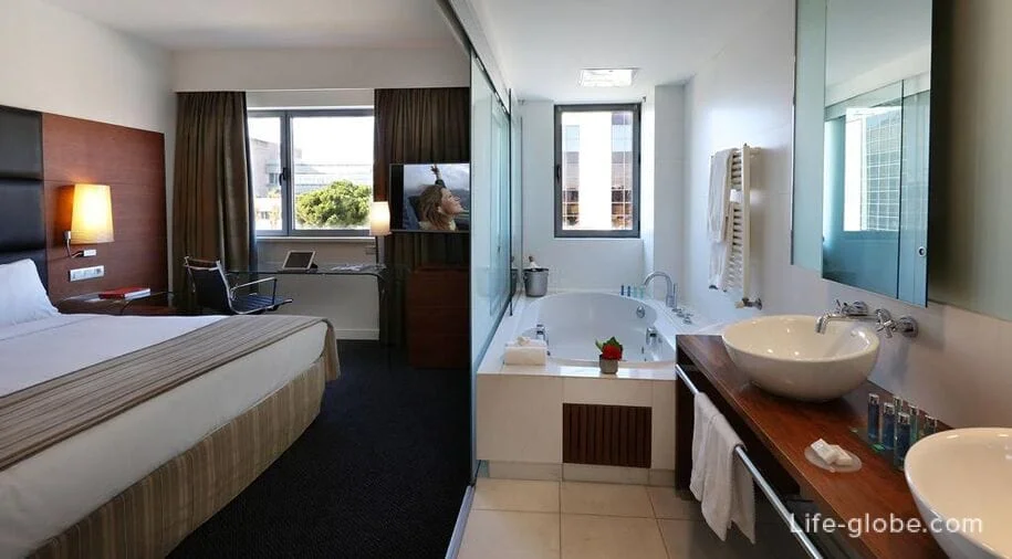 Имеется спортивный зал с тренажерами, на крыше терраса с бассейном, сауна. В отеле великолепная шумоизоляция, в номерах установлены кофемашины, мини бар, ТВ с русскоязычными телеканалами. В этом отеле соотношение цены и качества услуг наилучшее. Стоимость номера от 230 евро.