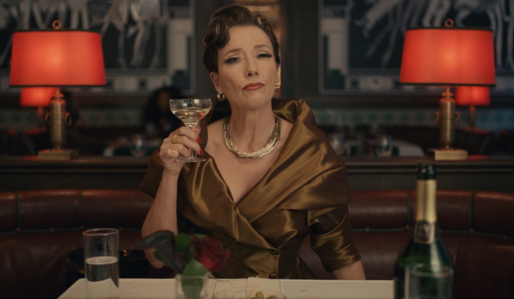 Здесь баронесса с Круэллой празднуют создание феноменального образа — платья для новой коллекции, покрытого крупными золотыми бусинами.