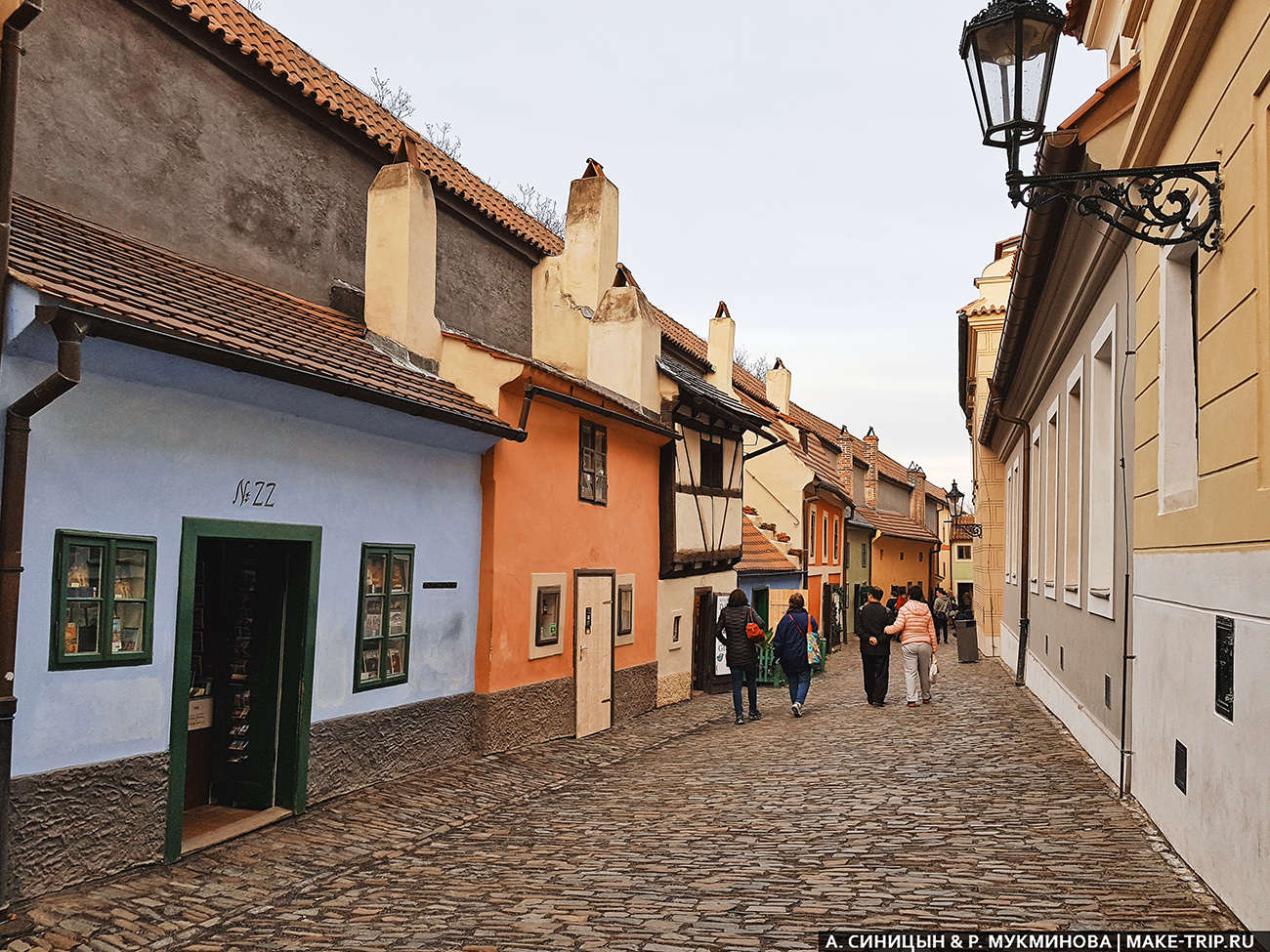 На Золотой улочке (Zlatá ulička) находятся те самые колоритные домики, которые вы видели на многочисленных фотографиях Праги. Они встроены в крепостную стену. Улица, хоть и чрезмерно популярна у туристов, необычайно интересная. В некоторых домиках функционируют магазинчики, в других восстановлен быт ремесленников. В доме № 22 жил Кафка. Все очень мило и уютно.