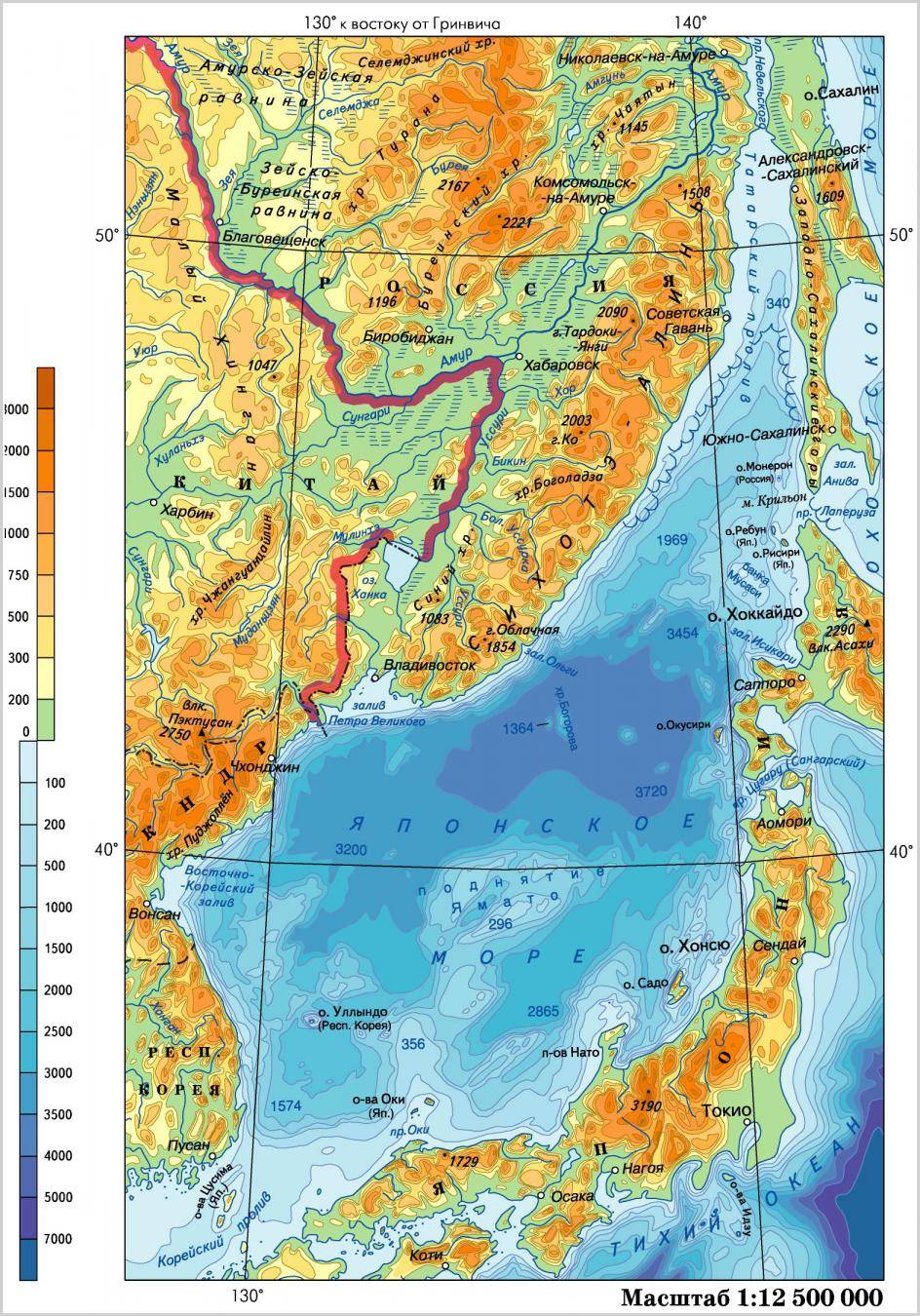 Японское море – окраинное море Тихого океана, расположено между материком Евразии, полуостровом Корея и островами Сахалин, Хоккайдо и Хонсю. Страны, омываемые этим морем – Россия, Япония, КНДР и Южная Корея. Японское море относится к наиболее крупным и глубоким морям мира. Его площадь равна 1062 км2, объем — 1631 тыс.км3, средняя глубина — 1536м, наибольшая глубина — 3699м. Это окраинное океаническое море. Крупных островов в Японском море нет. Из мелких наиболее значительны острова Монерон, Рисири, Окусири, Одзима, Садо, Окиносима, Уллындо, Аскольд, Русский, Путятина. В Корейском проливе расположен остров Цусима. Почти все острова находятся вблизи берегов. Большинство из них располагается в восточной части моря. Береговая линия Японского моря сравнительно слабо изрезана. Наиболее простое по очертаниям — побережье Сахалина, более извилисты берега Приморья и Японских островов.