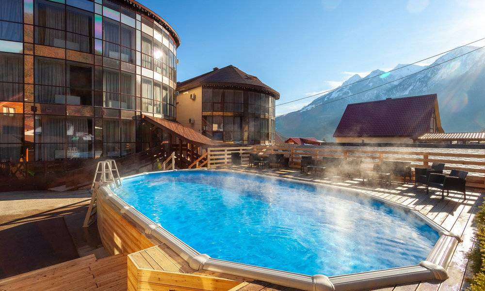 Гостиница подойдёт тем, кто хочет найти в Красной Поляне тишину и покой. Проведите день в тёплом открытом бассейне или джакузи с видом на горы, попарьтесь в бане или погуляйте по окрестностям — энергии и сил точно прибавится.