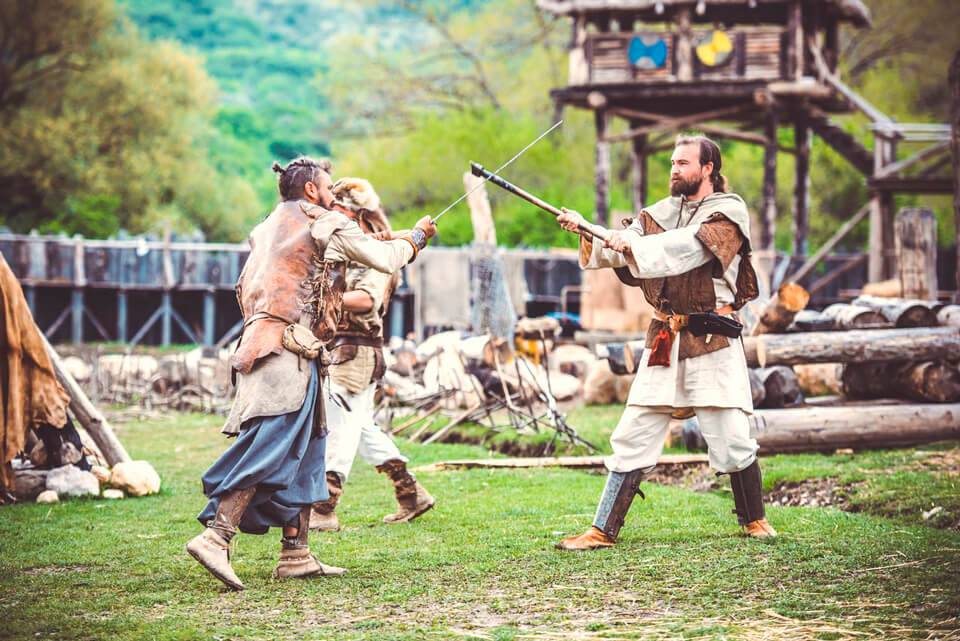 По периметру площади, обнесённой частоколом, выстроились деревянные дома и сторожевые башни. Кузницы, конюшни, сараи, мастерские, боевые площадки для тренировок, сельскохозяйственные поля, колодцы, кострище создают атмосферу раннего средневековья. Посетителям парка предоставляется возможность увидеть быт древнего племени, посетить многочисленные мастерские и обучиться военному искусству.