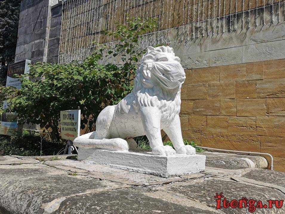 Лев у входа в санаторий облачён в маску. К сожалению тема коронавируса ещё долго будет актуальной.