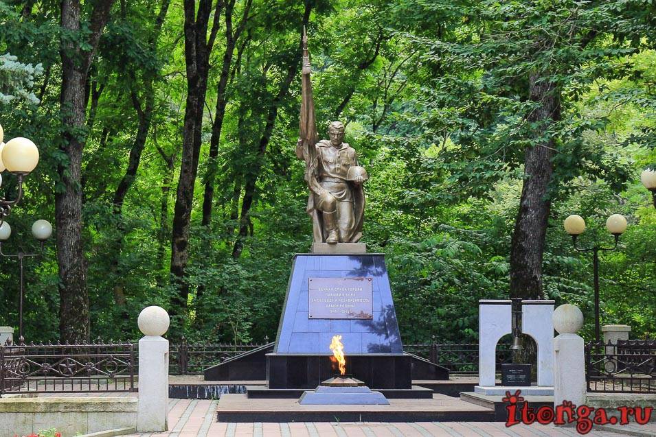 Памятник героям павшим в боях во время Великой Отечественной Войны и вечный огонь находятся у братской могилы на восточной окраине города. Кроме того, здесь посреди деревьев есть небольшая аллея памяти отдавших свою жизнь во время войны. Их имена высечены на мраморных плитах вдоль аллеи. Попасть сюда можно от статуи Скорбящей матери, которая находится возле водолечебницы, со стороны выезда из города.