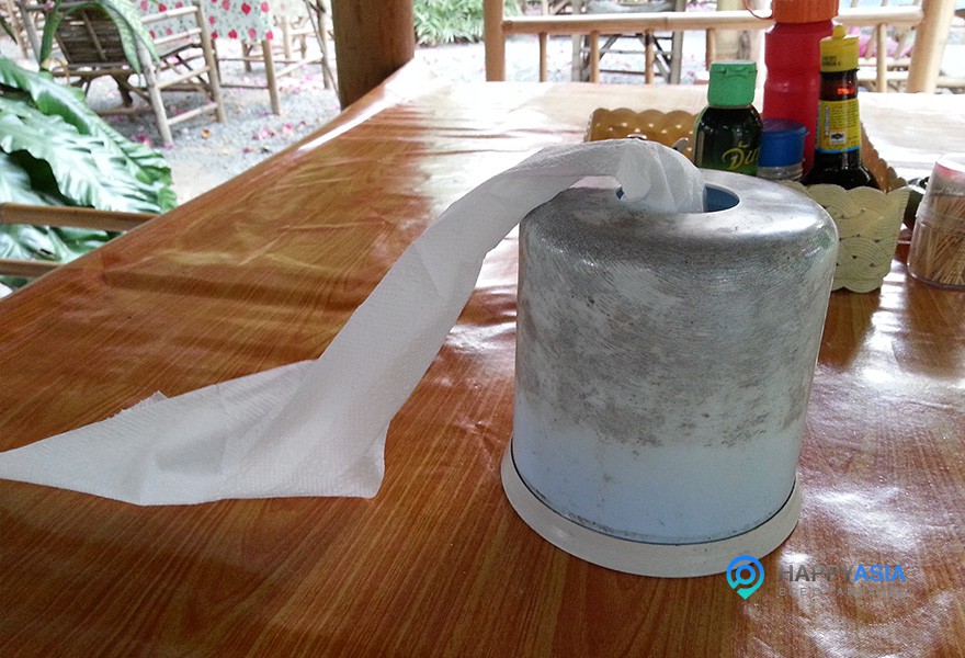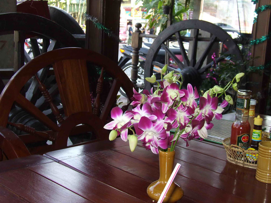 Как видим самые простые тайские кафе, на столе клеенчатая скатерть (ее может не быть вообще), мебель может быть деревянной или каменной. Под столом обычное мусорое ведро, чтобы как-то облагородить пустырь землю посыпали гравием и посадили цветы, теперь ветер кружит лепестки этих цветов по кафе.