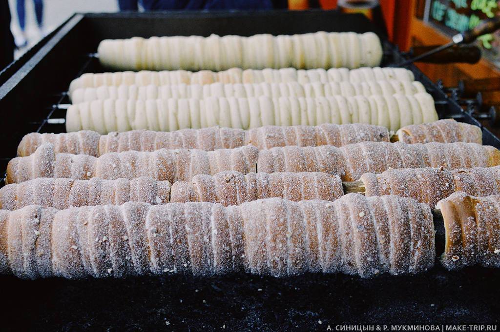 На улице невозможно пройти мимо вкусно пахнущих колбасок или обычной жареной картошки. Трдельники (Trdelnik) пекут прямо на глазах, и прохожему достается пышущий жаром пирожок.