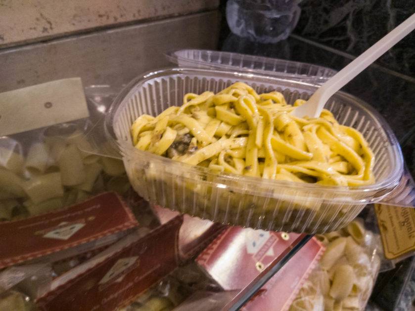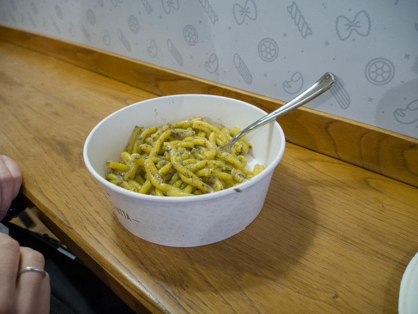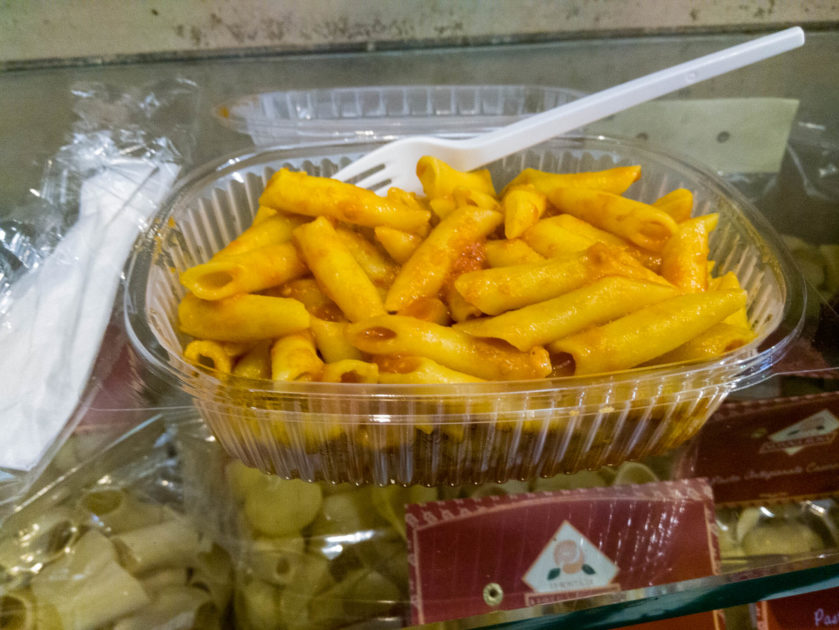 Второе заведение: Pastasciutta — паста за 6 евро рядом с Ватиканом. На выбор 6 вариантов и готовят при вас. Порции средние, обычные, соус тоже довольно простой. Подается в картонном контейнере или тарелке с пластиковой вилкой. Перекусить можно на месте или рядом.