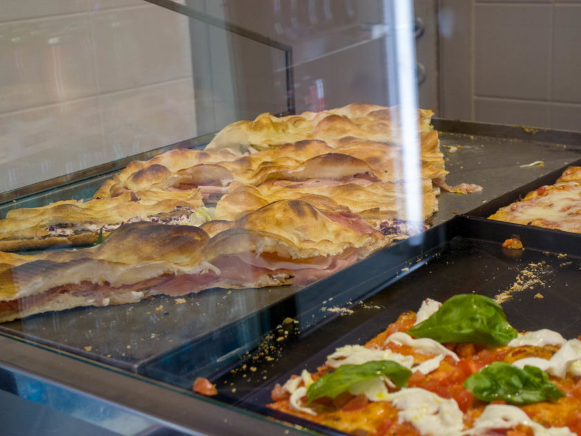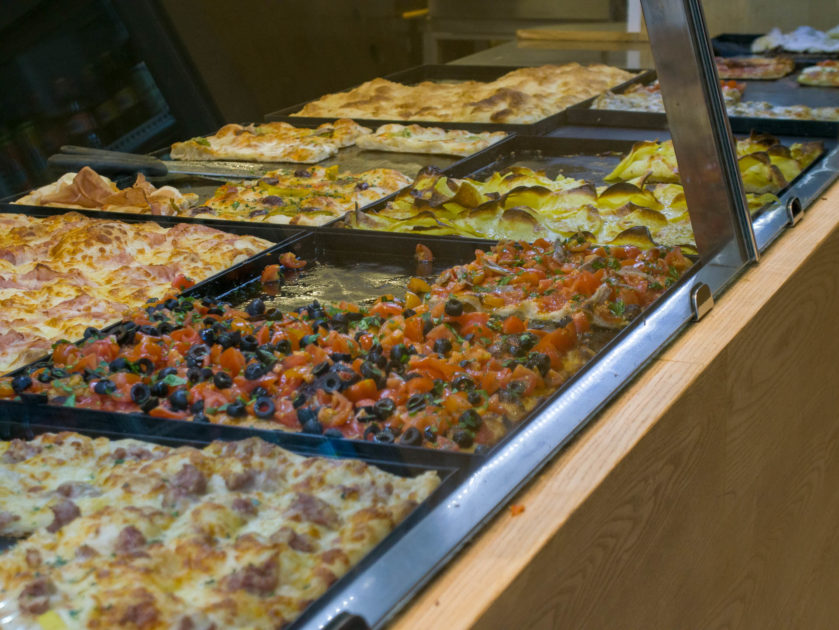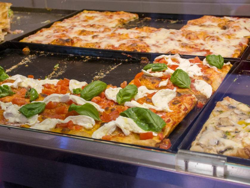 В этой пекарне пиццы продаются по весу. Нужно выбрать кусок любого размера и заплатить за него в зависимости от веса. Даже самый большой кусок вряд ли будет стоить дороже 6 евро.