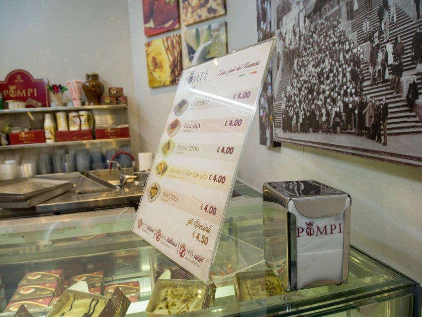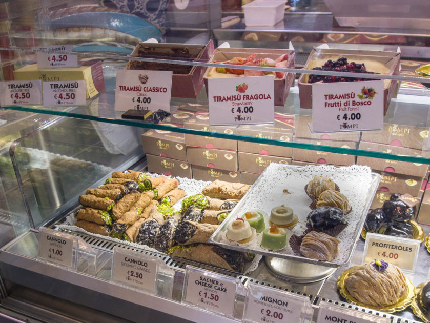 Все эти сладости мы покупали на вынос в Pompi. Сразу скажем, что не самый дешевый вариант, например тирамису и панна котта стоят по 4 евро, но они того стоят.
