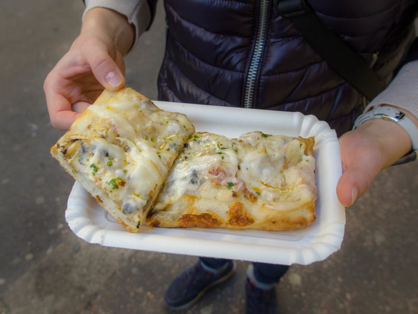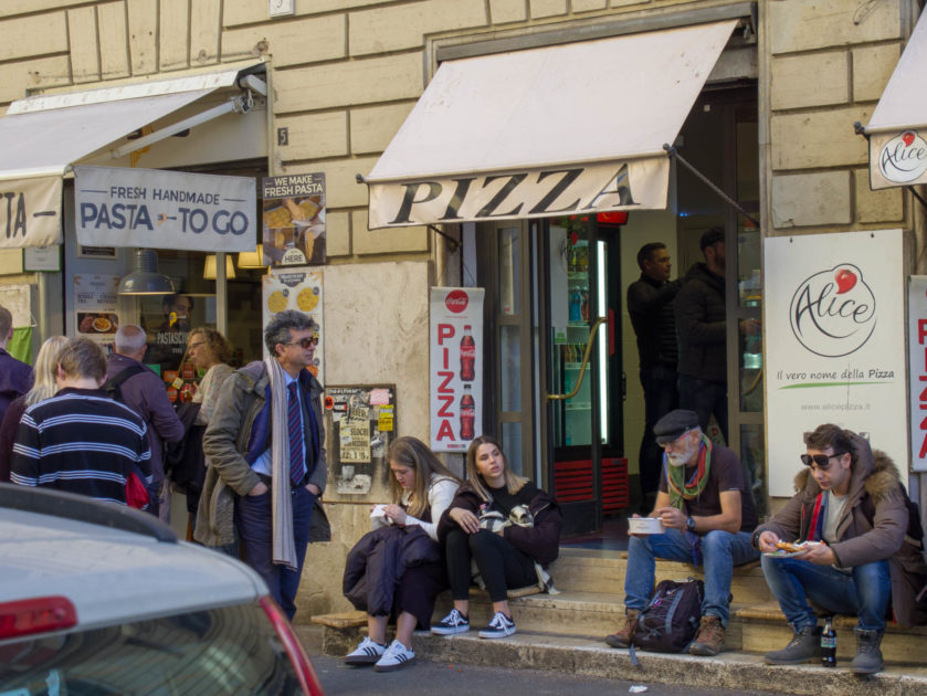 Ее делают все и на каждом углу, для себя мы выбрали Alice Pizza: сетевая пиццерия, пицца продается по весу и на вынос, но если повезет можно присесть за стойкой или на ступеньках пиццерии или просто рядом. Филиалы пиццерии есть и возле Ватикана и рядом с Пьяца-дель-Пополо и еще много где по всему Риму.