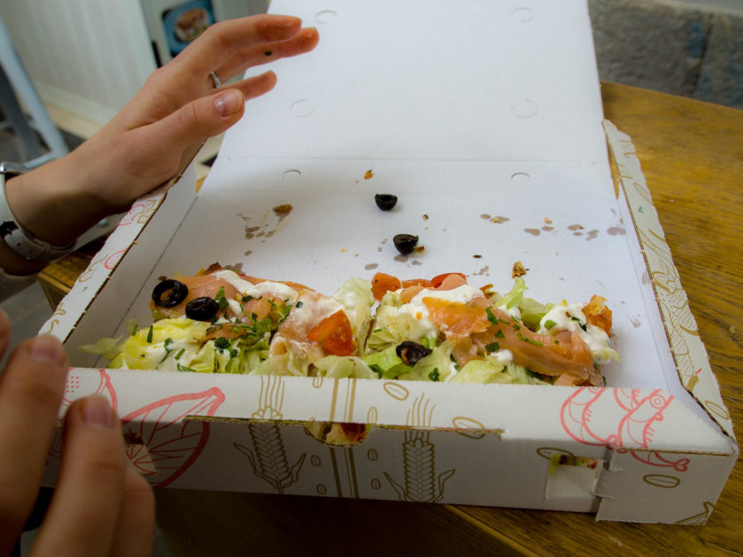 Подается в пластиковом контейнере, в придачу с вилкой упаковке и стаканчиком. Перекусить ее можно на месте или рядом, вода в бутылках бесплатная.