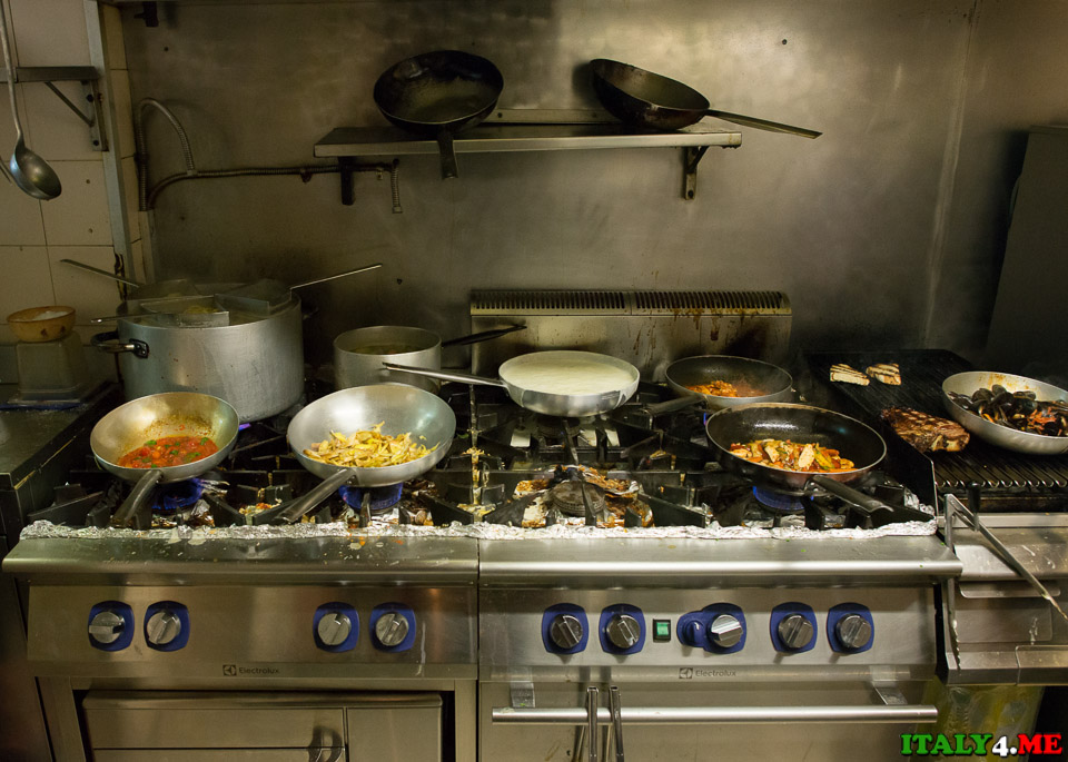 Весьма импонирует, что во многих итальянских ресторанах открытая кухня, и вы всегда можете посмотреть, как готовят ваше блюдо. Мои COZZE справа.