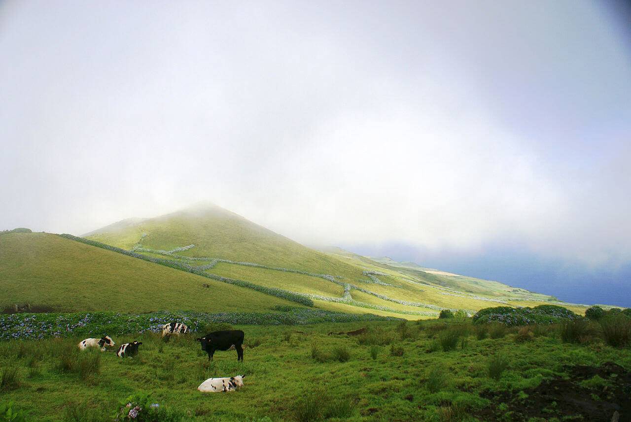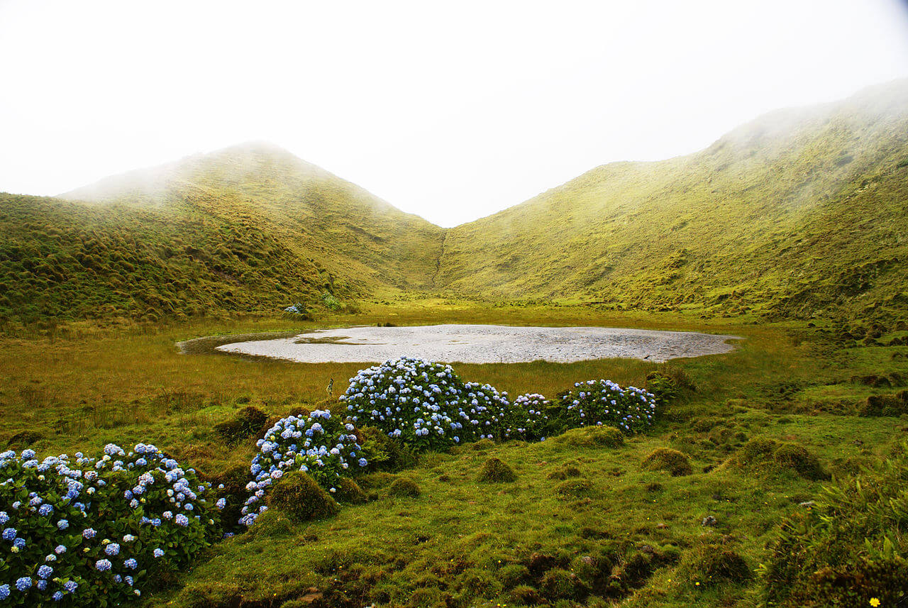 Остров Флориш переводится с португальского как “Остров цветов”. Название дано правильное: это один из самых красивых и зеленых островов архипелага, покрытый тысячами синих гортензий и других цветов.