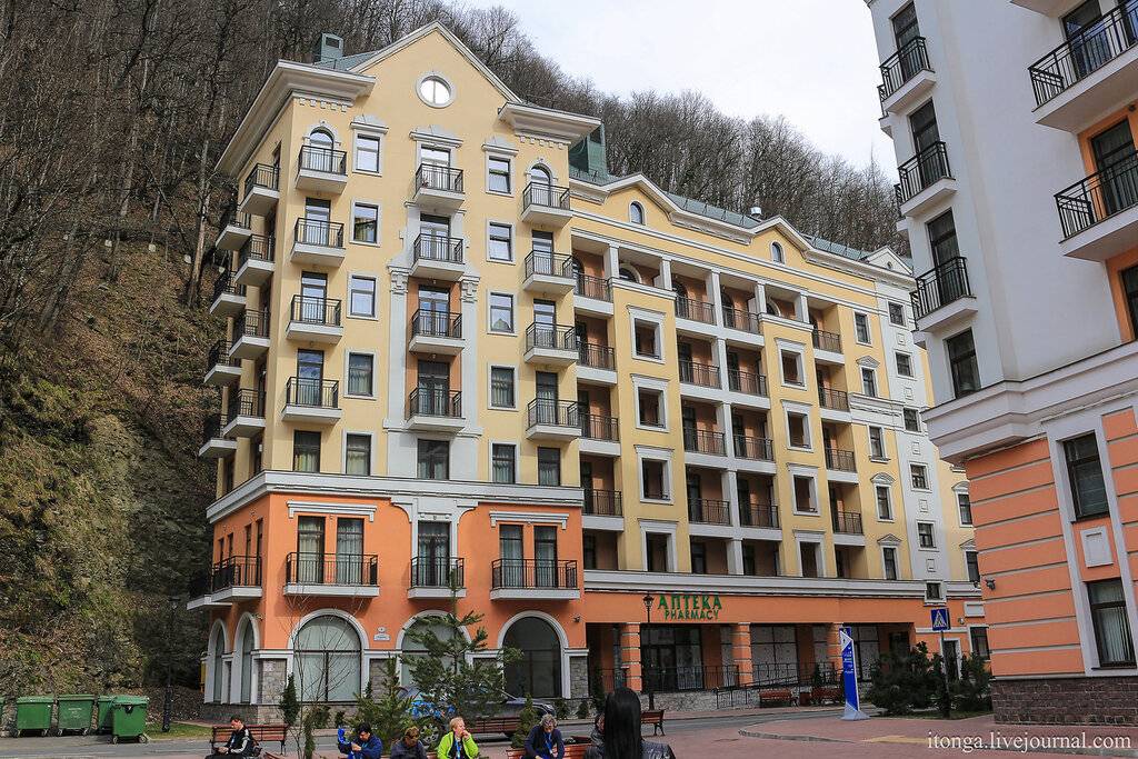 Параллельная улица представляющая собой апартаменты Роза Хутор «Valset» от «Azimut». Главная достопримечательность улицы это … Аптека. Аптека ни какая-то особенная, а самая обыкновенная, с довольно посредственным ассортиментом. Дело в том, что Красная поляна, Роза Хутор и даже Адлер практически не имеют аптек в шаговой доступности, по крайней мере я видел аптеку только здесь. То есть если ты простыл и заболел — это реально твои проблемы, а в связи с перепадами температур простыть было более чем легко.