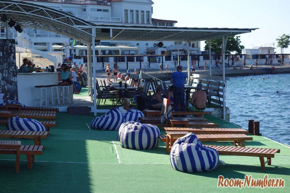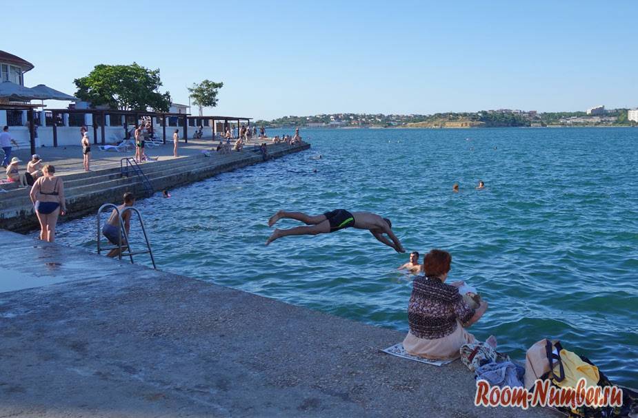 На самом деле это никакой не пляж, а обычная бетонная набережная, которая так понравилась местным жителям, что им даже не хочется ездить в соседнюю Учкуевку. Есть всё для отдыха — море, шезлонги, зонтики, раздевалки, кафе. А прыгать в воду можно прямо с асфальта.