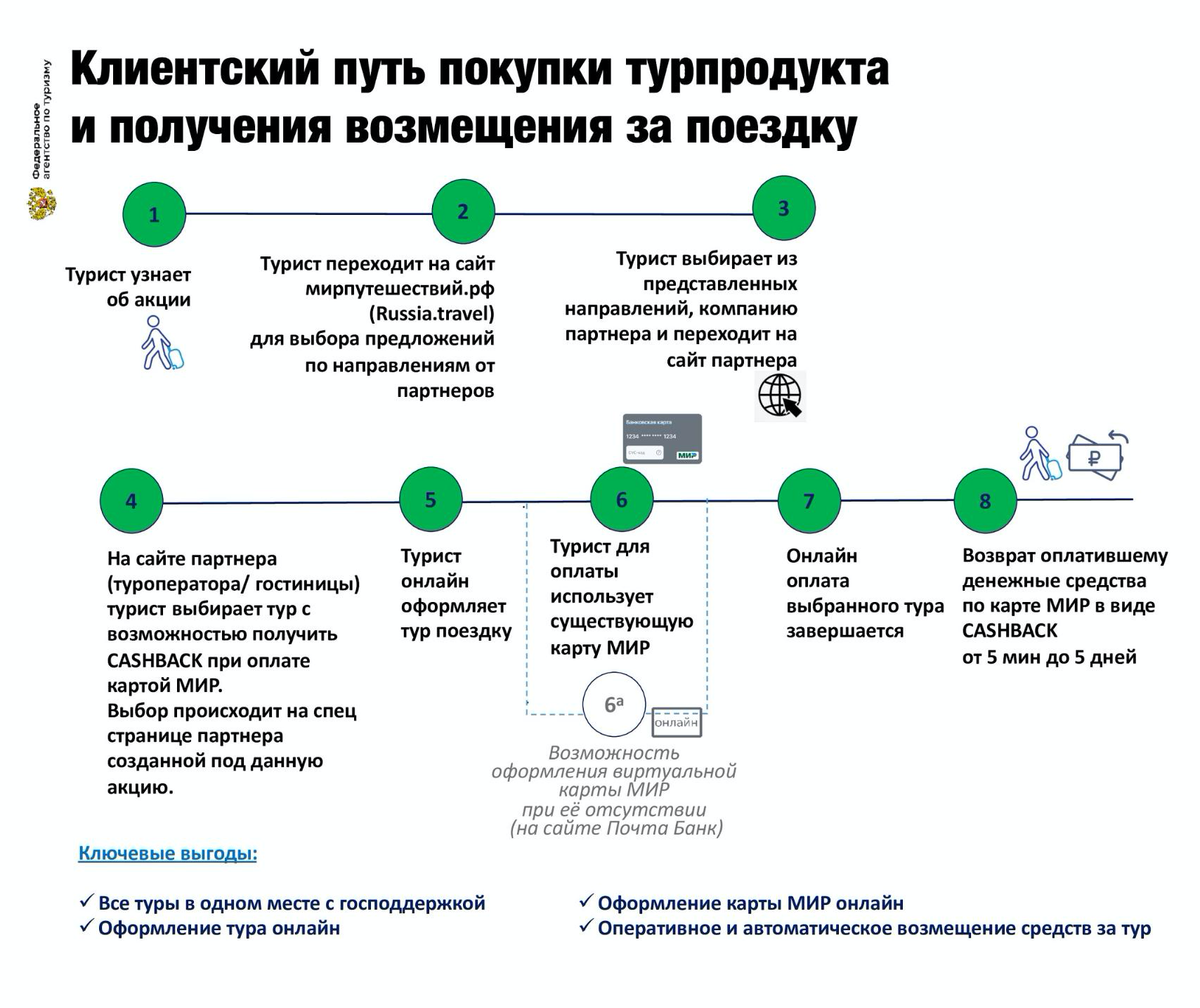 Схема получения кэшбэка из презентации Ростуризма. Ведомство пишет, что можно оформить виртуальную карту «Мир» на сайте «Почта-банка». Но пока там предлагают оформить только карты американской системы «Виза»