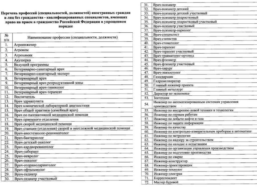 Перечень специальностей публикуется в свободном доступе. Составляет его Минтруда России. К заявке на гражданство РФ в упрощенном порядке придется приложить документацию с места работы (в т.ч. о занимаемой в этот период должности), а также подтвердить свою квалификацию документом об образовании.