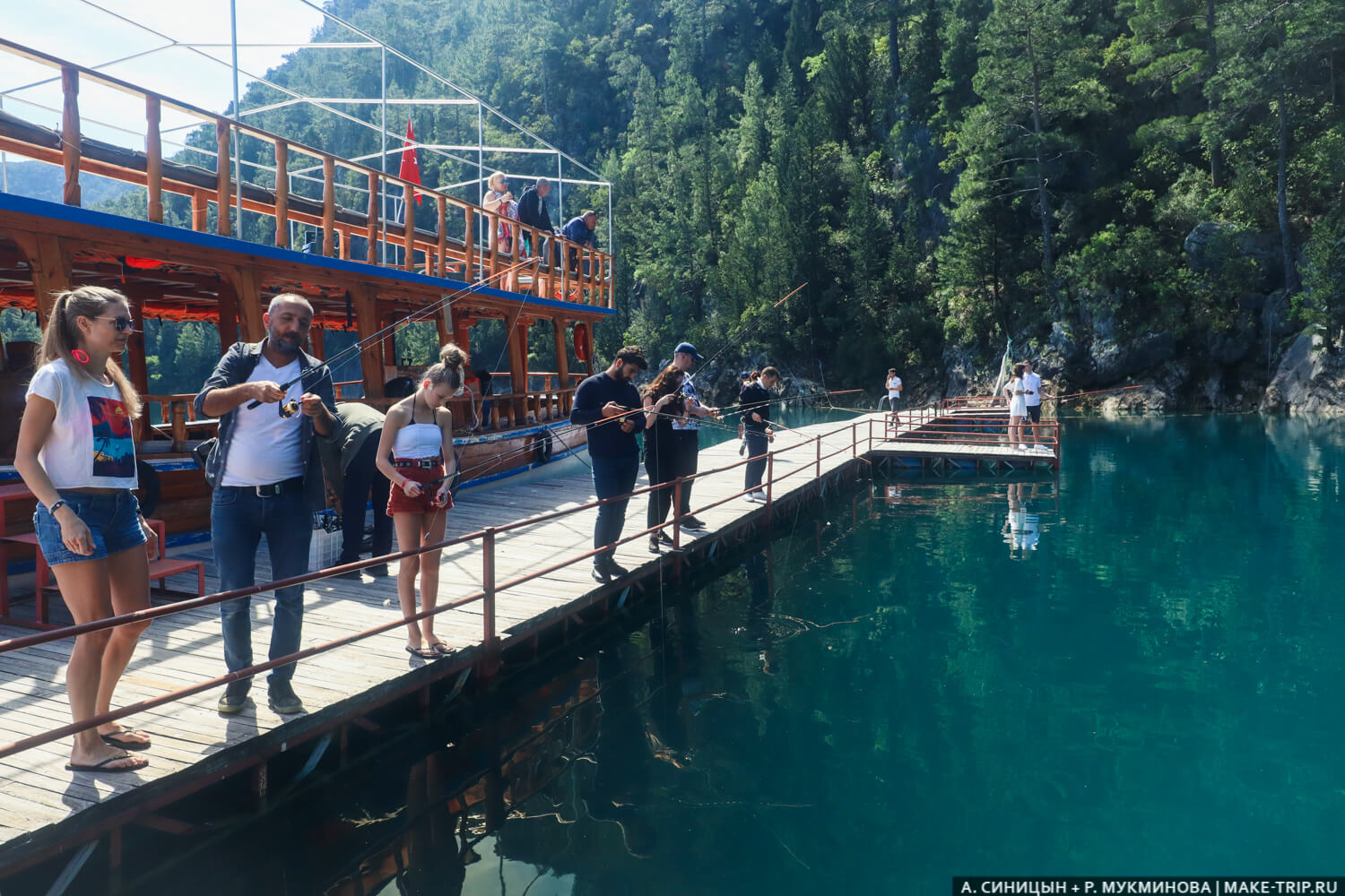 На прогулке, по лазурным водам Грин каньона в Сиде, люди любуются чистой кристальной малахитовой водой и отвесными скалами с густой растительностью. В этом удивительном месте получаются потрясающие фотографии на фоне природы.