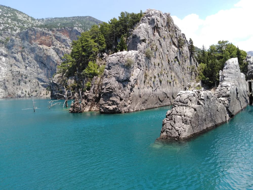 Зелёный каньон — это часть водохранилища, которое образовалось в результате строительства плотины. Оно считается крупнейшим искусственным водохранилищем Турции. Только представьте, его площадь — около 500 гектаров! Там, где каньон широк, спокойно и умиротворенно. В зеркальной глади тихой воды отражаются каменные островки и берега, поросшие соснами. Но в месте, где каньон сильно сужается, под отвесными скалами ущелья чувствуешь себя маленьким и беспомощным человечком. Кое-где изумрудная вода затопила деревья, и их торчащие над поверхностью скелеты вызывают смутную тревогу. Каньон столь узок, а горы так высоки, что даже широкоугольный объектив не может захватить в одном кадре весь этот грандиозный пейзаж. Очень красивое место, сильно впечатляет. И иначе, как с воды, эти потрясающие виды просто не увидишь, так что эту экскурсию в Турции точно не стоит пропускать.