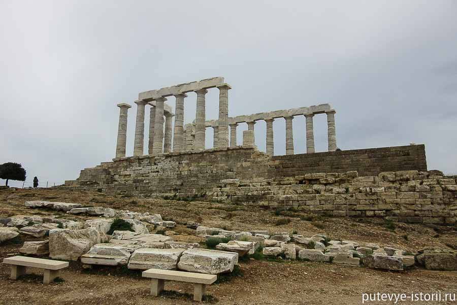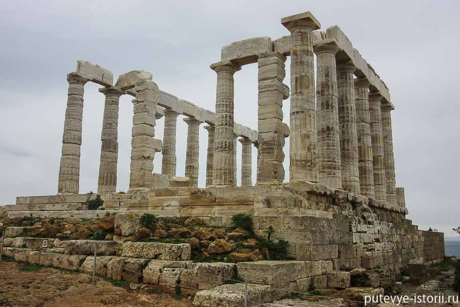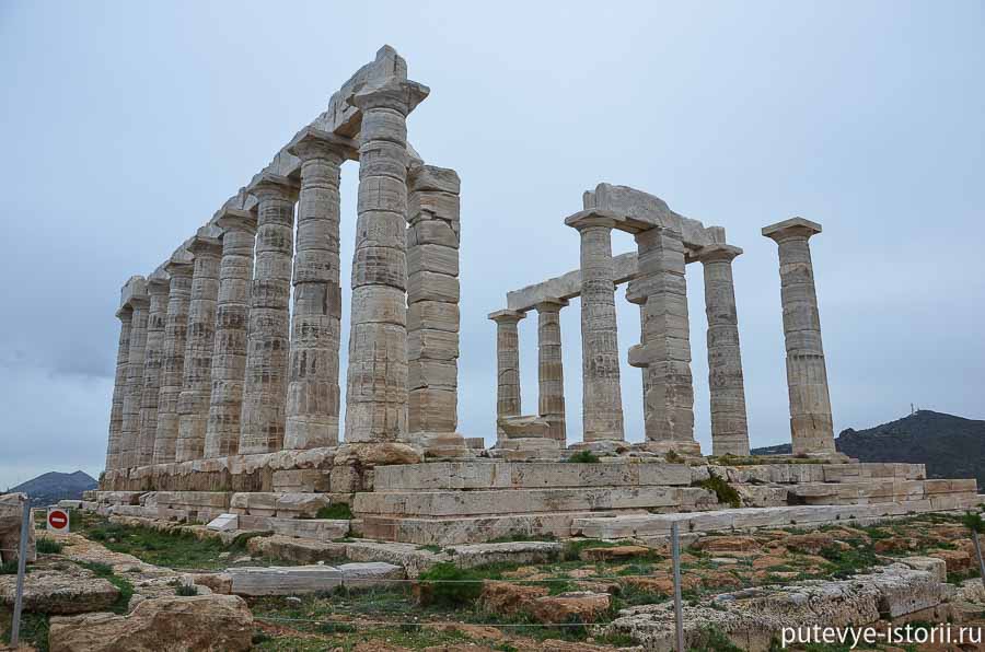 На самой высокой точке мыса стоят колонны храма Посейдона. Сохранилось 17 колонн. Выполненные из местного агрилезского мрамора, они, в отличие от колонн афинского акрополя, светло-серого цвета, но на фоне неба кажутся ярко-белыми. Смотрятся они прекрасно.