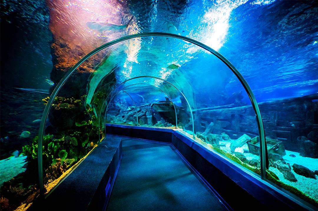 Алексей: «Здесь 30 аквариумов, где обитают морские коньки, морские звезды, акулы, скаты, соты и тысячи других обитателей глубин. Можно увидеть более 100 видов пресноводных, обитающих на территории всех континентов. Пешеходный акриловый тоннель проходит через все аквариумы!».