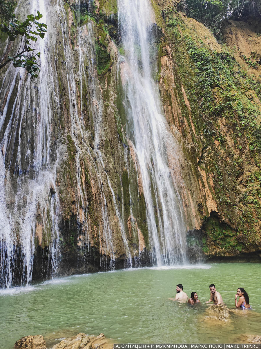 Туристы купаются в бассейне под водопадом Эль-Лимон в Доминикане. Это популярная достопримечательность.