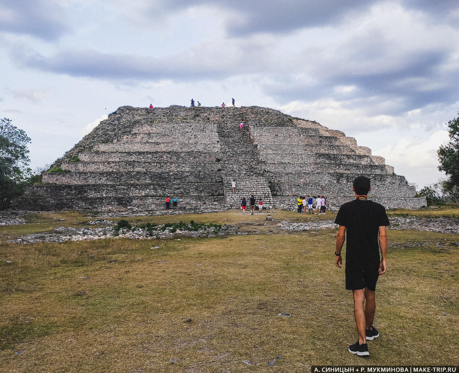Самая грандиозная пирамида Исамаля посвящена богу солнца майя Кинич Как Му. Размеры ее просто непостижимы — одно только основание занимает площадь 8000 м². Именно она и стала первой пирамидой майя, которую мы увидели и на которую поднялись.