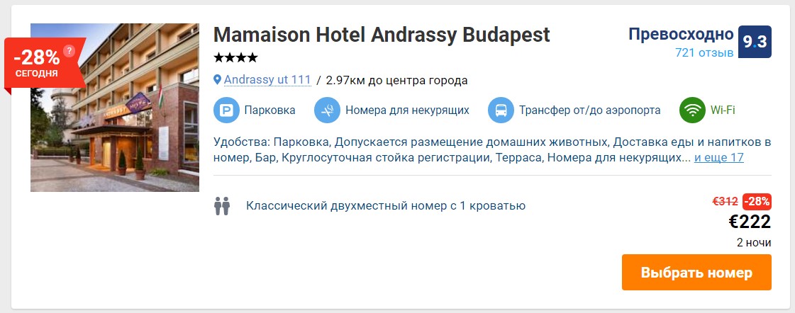Стоимость 2 суток проживания в отеле 4* обойдется вам в €222 за двухместный номер – это уже цена со скидкой 28%.