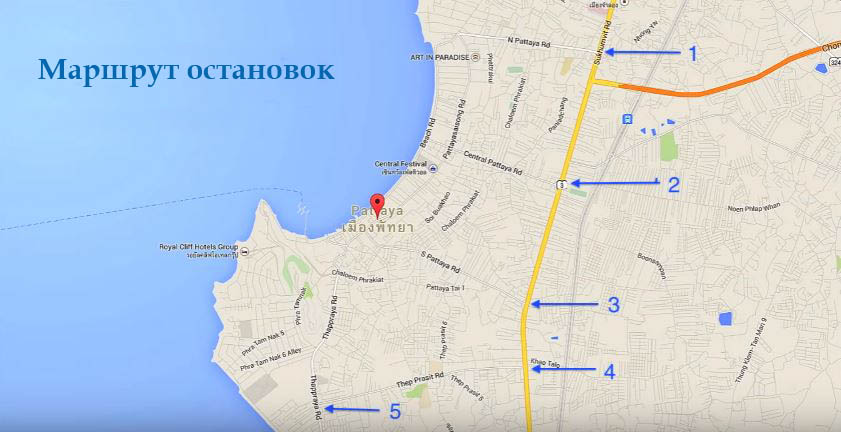 В Паттайе этот автобус делает 3 остановки: на Сукхумвите, на Центральной и Южной улице.
