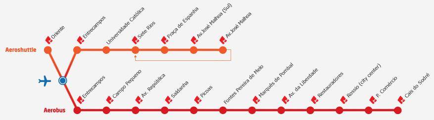 У этого автобуса два маршрута по центральным улицам города, где расположены популярные отели, вокзалы. Один проходит от лиссабонского вокзала Cais do Sodre, отправление с интервалом 20 минут. По второму маршруту движение автобусов каждые 40 минут через автовокзал 7 Rios в деловой центр столицы. Дорога на шатле занимает 30-40 минут. Куда едет автобус, написано на стекле. Чтобы выйти на остановке, нужно нажать кнопку «стоп на поручне.