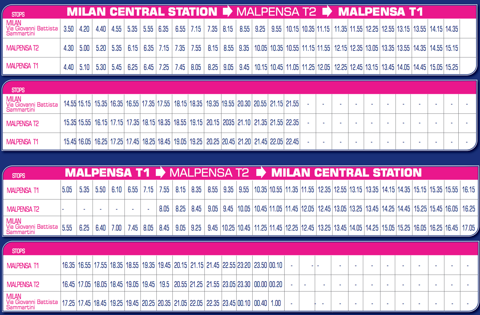 Автобусы до Милана отправляются от выхода № 4 каждые 20 минут и называются «Мальпенса Шатл» (Malpensa Shuttle) и делают остановку около терминала 2.