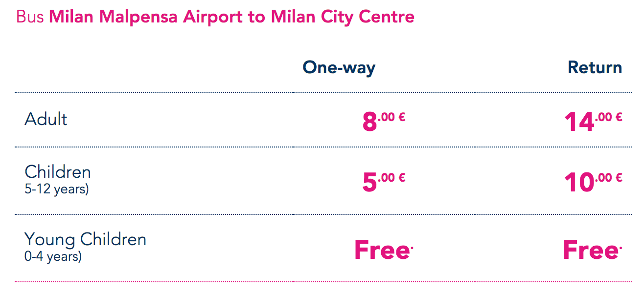 Билеты можно купить на борту, проезд в одном направлении обойдется в 13 евро, туда и обратно – в 26 евро. Автобусы предоставлены компанией Malpensa Shuttle.
