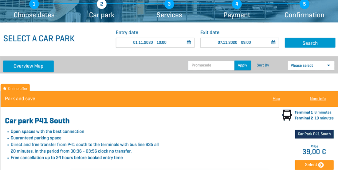 Выбрать и оплатить парковочное место заранее можно здесь. При выборе парковок будет указано, сколько от каждой из них добираться до терминалов, и какие опции есть у каждой из них.