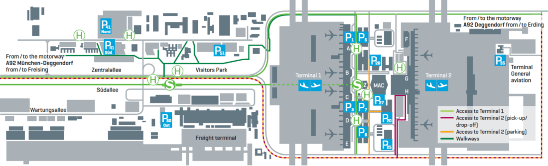 Интерактивную карту терминалов можно посмотреть на официальном сайте https://navigation.munich-airport.de/