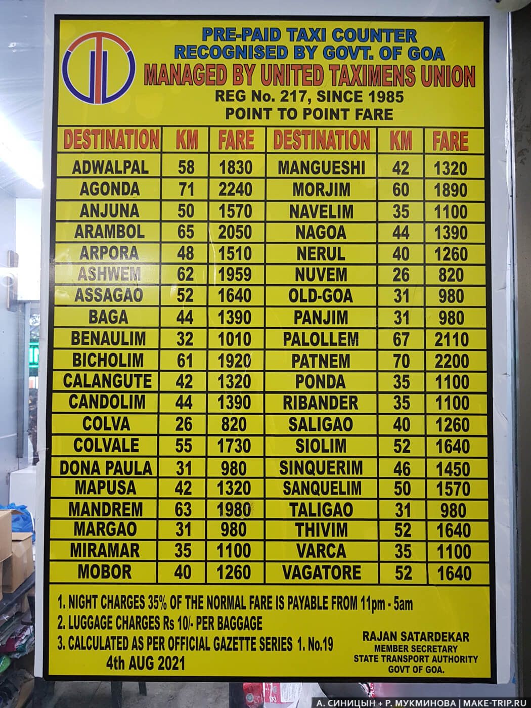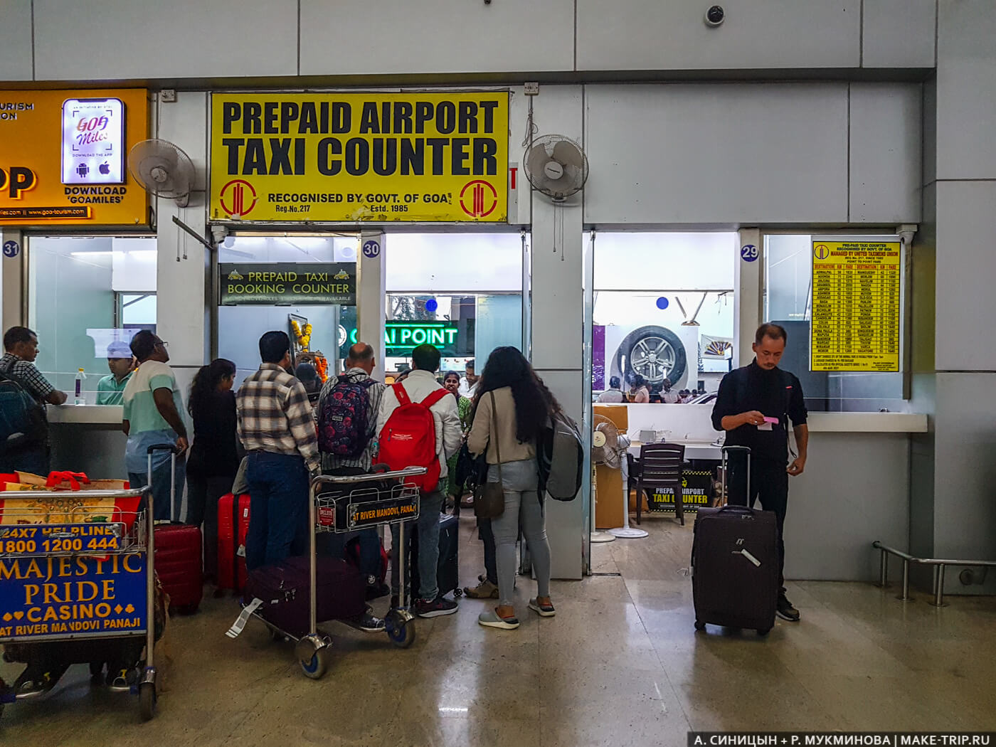 Стойка «официалов» расположена при выходе из аэропорта, работает круглосуточно. Вам нужно всего лишь сказать, куда вы едете, а персонал выпишет квитанцию. Там же есть стенд с указанием курортов и расстояний до них. Примерная стоимость поездки – от 425-510 INR. Скажем, чтобы добраться до одного из самых красивых пляжей Гоа – Палолема, – вы должны будете заплатить около 2300 INR (расстояние 67 км). Цены немаленькие, так что выгоднее ехать компанией из нескольких человек. Цены на странице указаны на октябрь 2018 г.