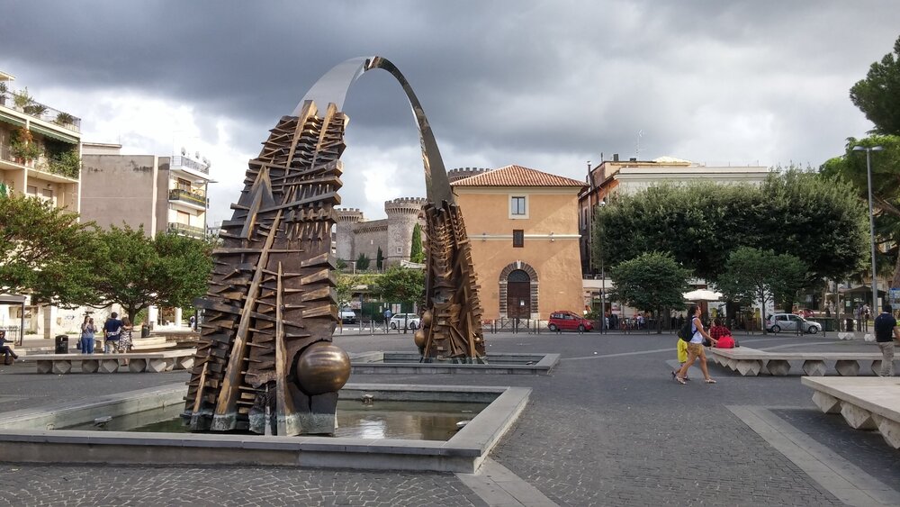 Все это перемешано с современным искусством. Прямо напротив выхода из виллы д’Эсте стоит уродливый бюст в луже, которая должна была быть фонтаном, а на площади Гарибальди в 2007 г. возвели арку Arco dei Padri Costituenti (Арка Отцов-Основателей). Ее автор — известный итальянский скульптор Арнальдо Помодоро (Arnaldo Pomodoro), автор шара в Ватиканских садах. За аркой проглядывают массивные башни замка Папы Пия II, который чаще называют Rocca Pia (Рокка Пиа). Туда тоже можно дойти, если позволяет время.