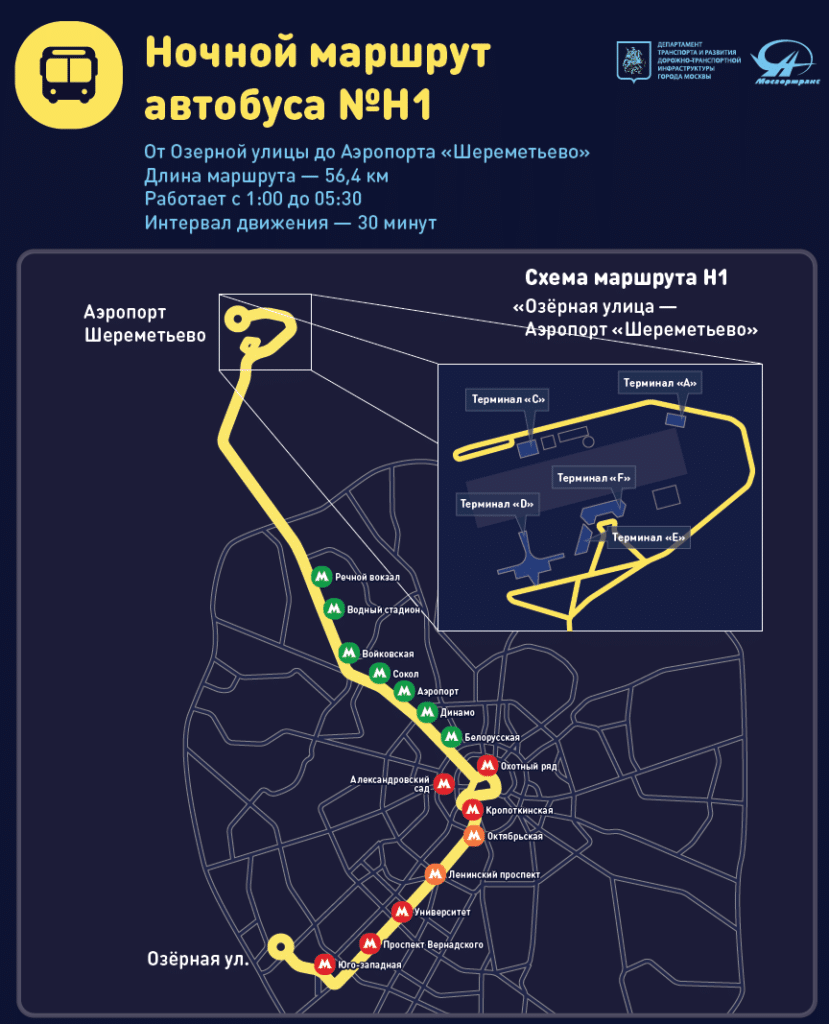 - на метро ехать до станции Планерная, затем на автобусе №817 или маршрутном такси №948. Автобусы и маршрутки следуют в Шереметьево к терминалам F, E→ D →B