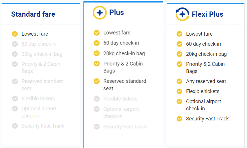 На официальном сайте лоукостера можно выбрать три разных тарифных плана, в зависимости от перечня услуг, которые вы желаете добавить в свое бронирование. Давайте рассмотрим каждый тариф подробнее.