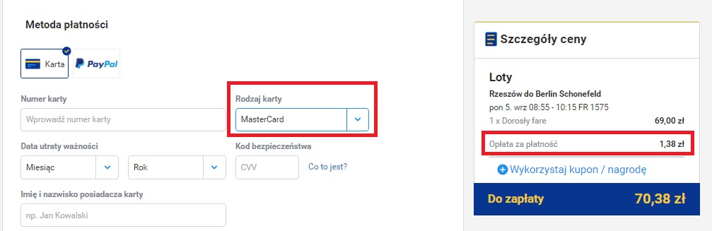 Заполняем данные для оплаты авиабилета. Заметьте, что тип платежной карты может добавлять комиссию (небольшую).
