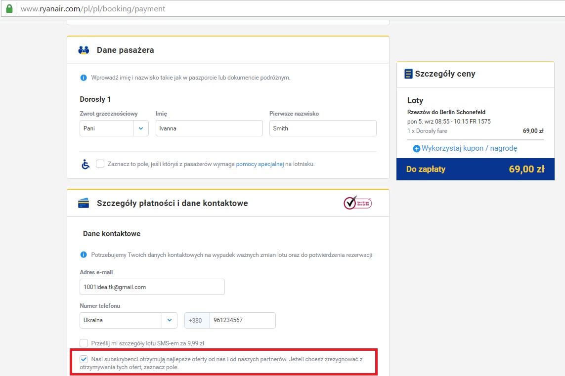 Нас спрашивают, мы все же не хотим приобрести себе места — отвечаем « Нет, спасибо «. Заполняем данные пассажира. Если вы не хотите получать письма с акциями от авиакомпании, ставьте галочку, как ниже.