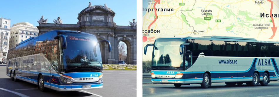 Поездка на автобусе относится в Испании к разряду бюджетных, т. к. в стране это самый дешевый вид транспорта. Наиболее популярным перевозчиком является частная компания ALSA, которая обслуживает и сообщение с Португалией. Билеты на экспресс стоят от €65 до €95.