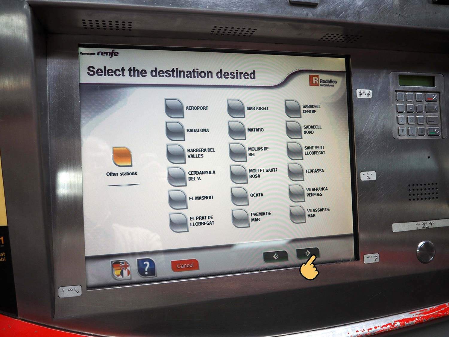 3.После выбора вида билета (в нашем примере выбран «ADULT SINGLE») на экран выводится список наиболее часто запрашиваемых станций назначения. В предложенном перечне турист может не найти нужной ему станции, так как этот список больше ориентирован на местное население. В этом случае надо перейти на следующую страницу, коснувшись стрелки внизу экрана.