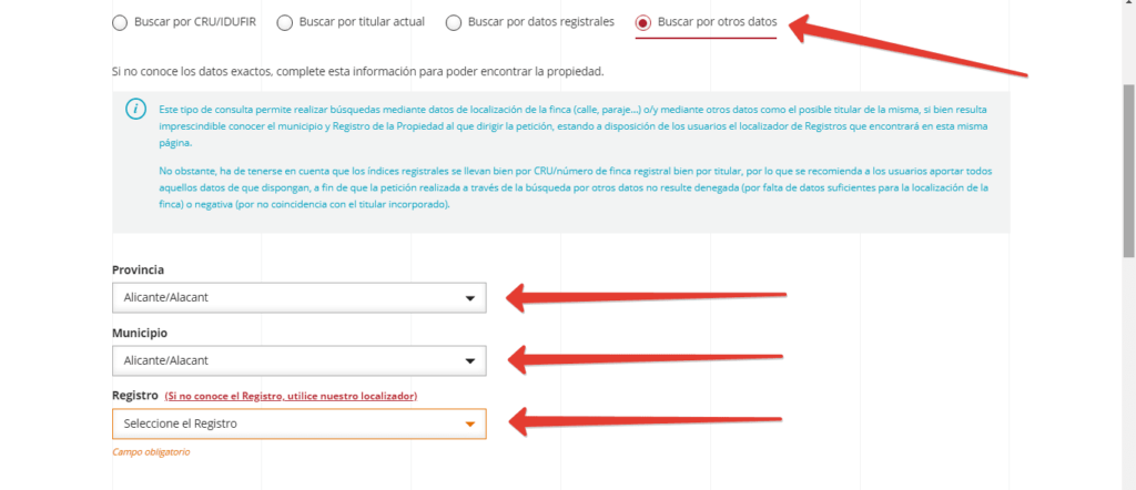Нажимаем на опцию BUSCAR POR OTROS DATOS, выбираем провинцию, муниципалитет и номер регистра (учреждения), к которому относится Ваша недвижимость. Если с последним пунктом у Вас возник вопрос, нажмите на Si no conoce el Registro, utilice nuestro localizador. Всплывет новое окно, где нужно просто ввести адрес и програма сама найдет правильный вариант.