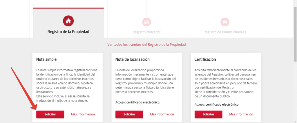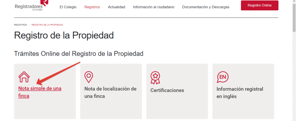 На главной странице выбираем опцию NOTA SIMPLE DE UNA FINCA.