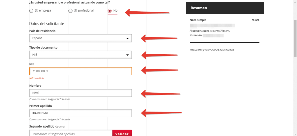 - ¿Es usted empresario o profesional actuando como tal? – для частного лица выберите «No».