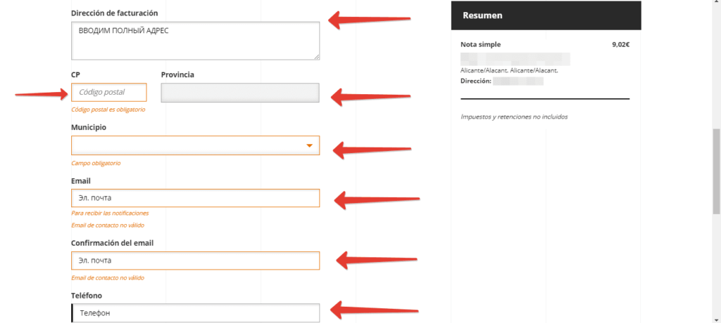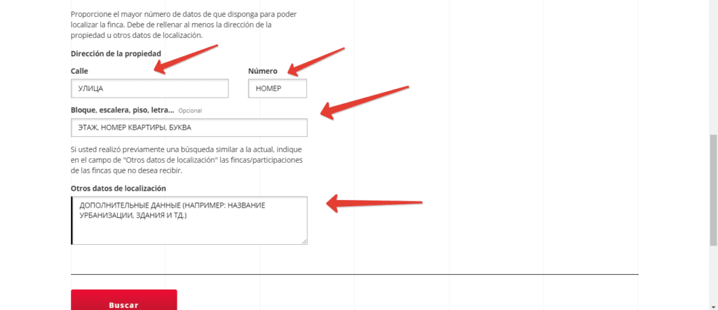 Заполняем оставшиеся поля формы: calle (улица); número (номер дома); Bloque, escalera, piso, letra… (тут можно указать блок, этаж, номер или букву квартиры).