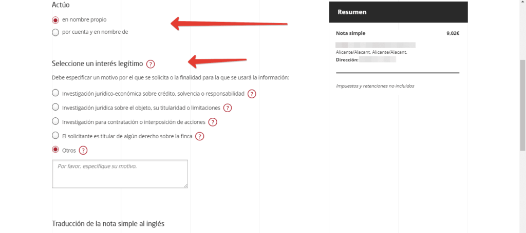 - Выбрать мотив для чего вам требуется Нота Симпле. Отмечаем «Otros» и для визы пишем, например, «Trámites en el consulado en Kiev/Moscú» (заменить на свой город). Для покупки недвижимости «El solicitante es el interesado en compra de esta vivienda. Solicito una Nota Simple Registral con información sobre la titularidad y los derechos que recaen sobre el inmueble».
