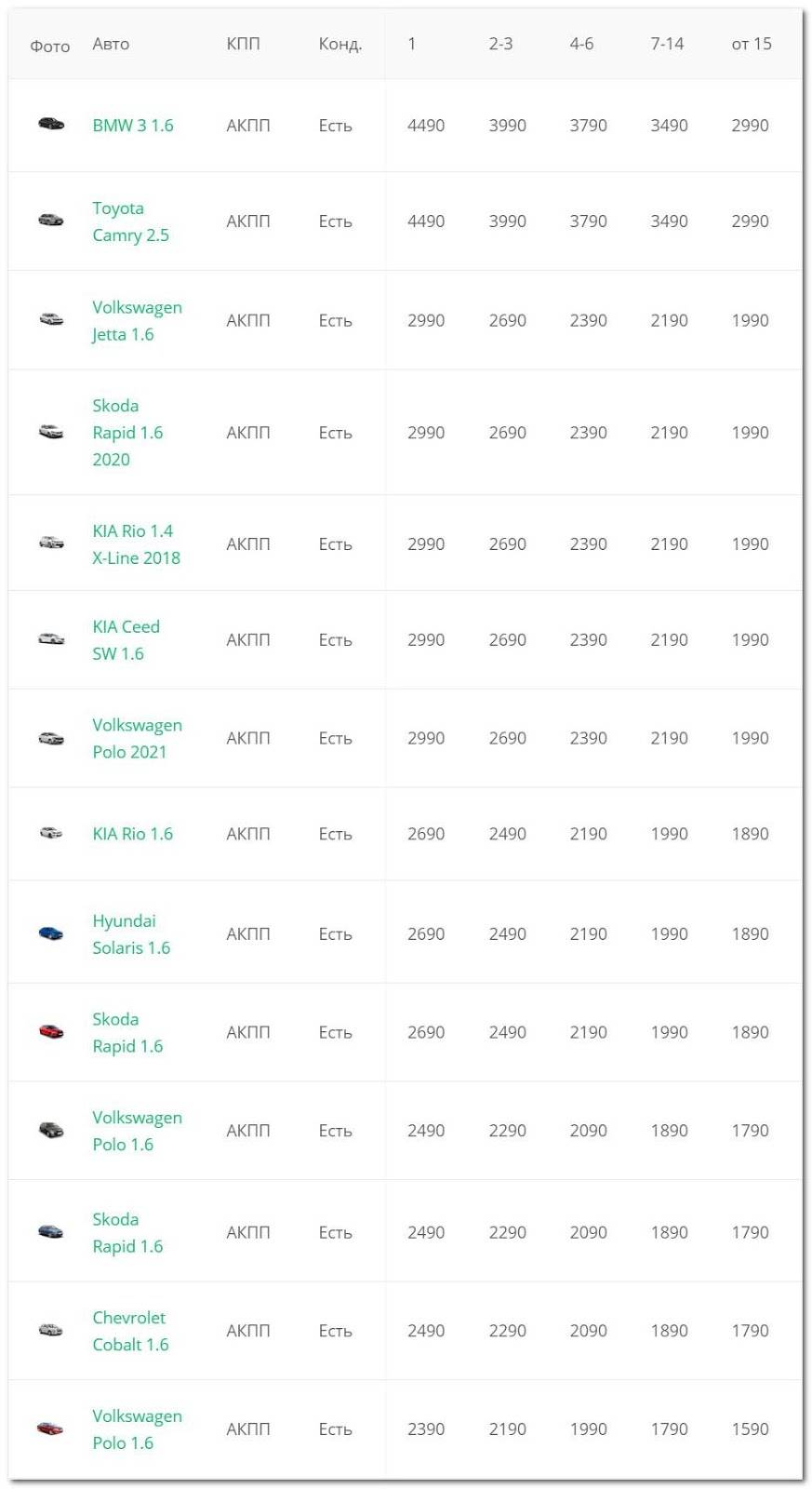 В гараже множество транспорта: бюджет, стандарт, бизнес и премиум. Таким образом, здесь можно найти машину не только для личных целей, но и для деловых поездок и мероприятий. Есть следующие модели: Toyota Camry, Kia Ceed, Chevrolet Cobalt, Nissan Almera, Renault Symbol, Renault Logan. Все транспортные средства 2014 и 2019 годов выпуска.
